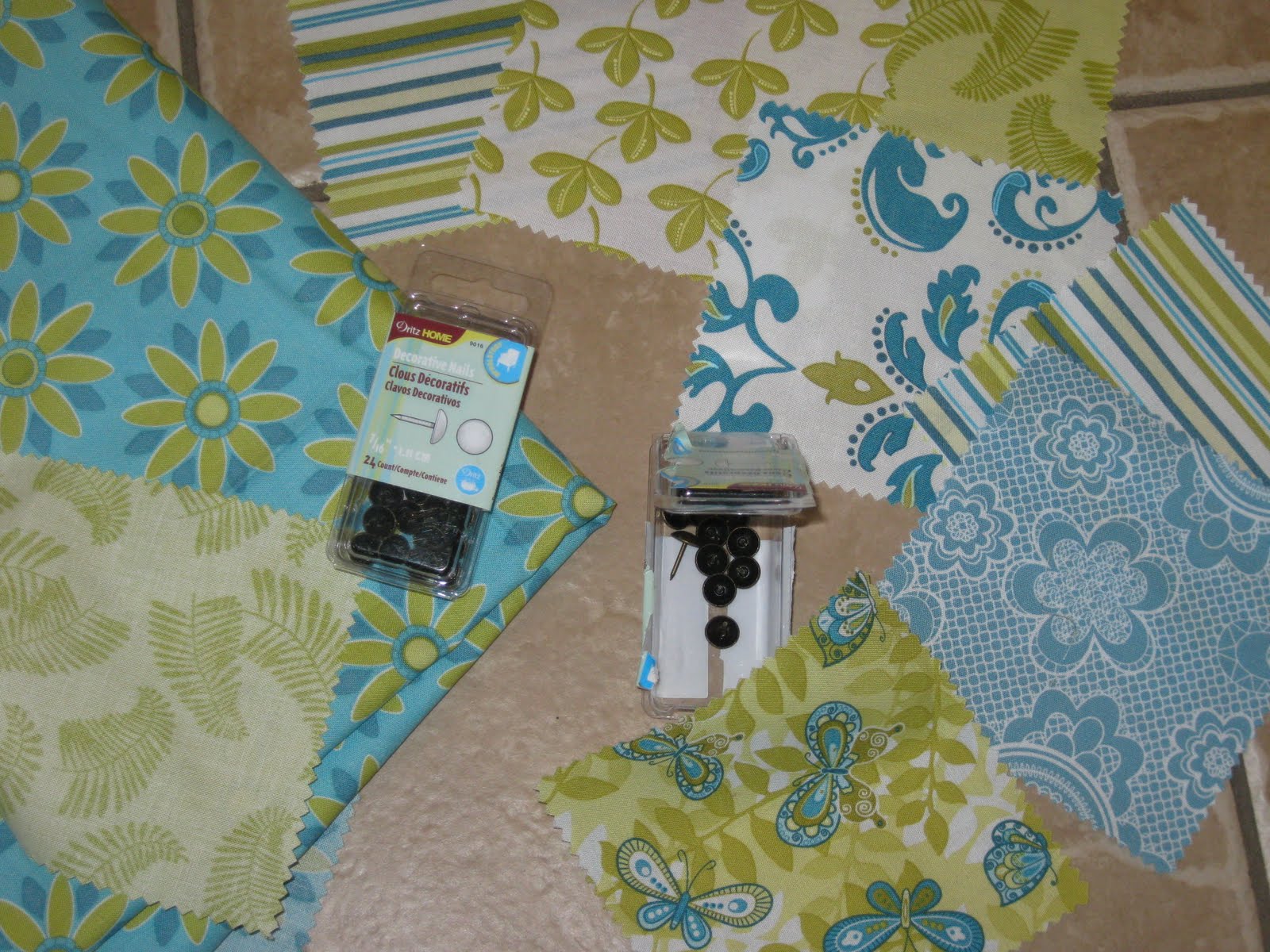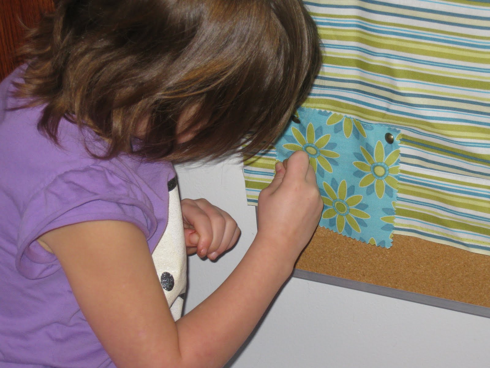 À la base, mon support (un vrai vieux babillard de liège) n’étant pas très joli, j’ai eu l’idée de le transformer. Lors du déménagement, j’ai profité de mon beau-père pour le fixer au mur et depuis, il me narguait! Côté « tissu-fils-couture » je suis aucunement douée, voir même peu intéressée, mais quand je vois tout le pouvoir créatif et les beaux tissus, ça me donne le goût d’essayer des trucs, un peu comme ma guirlande de Noël.