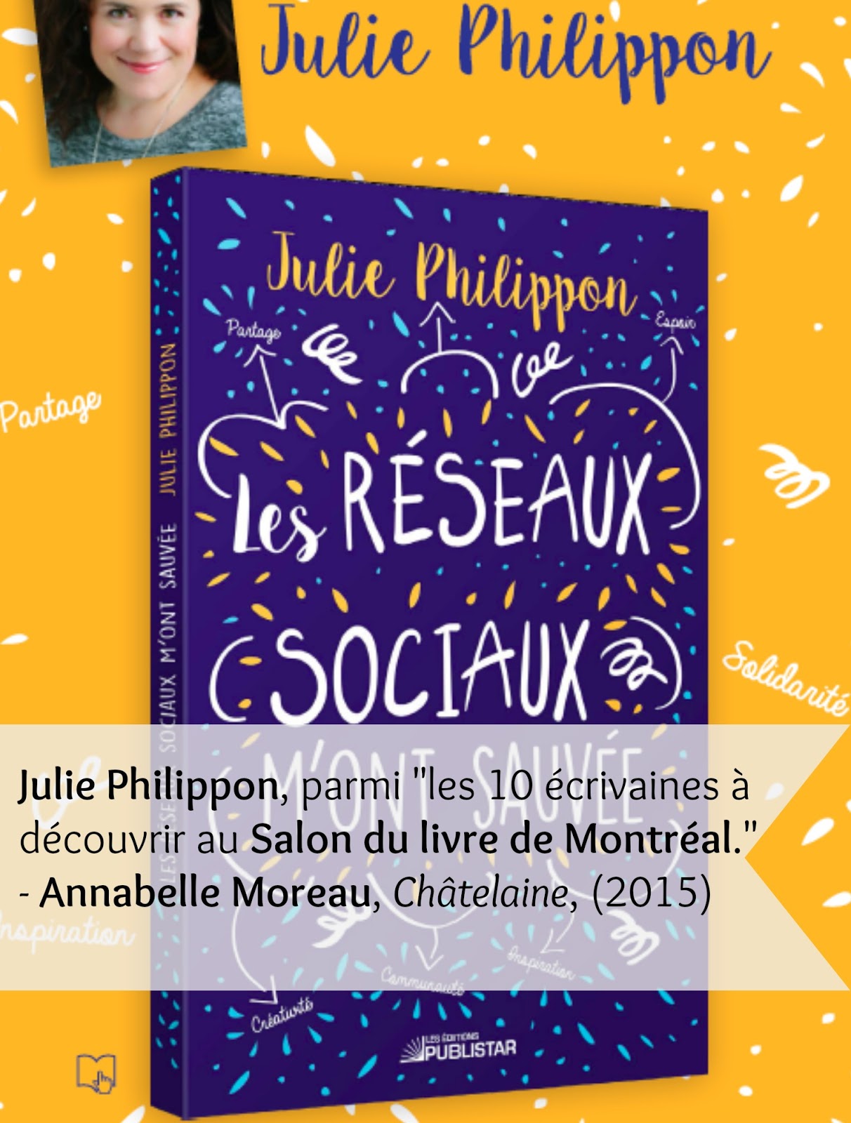 Julie Philippon, « parmi les 10 écrivaines à découvrir au Salon du livre de Montréal. » – Annabelle Moreau, Châtelaine, (2015)