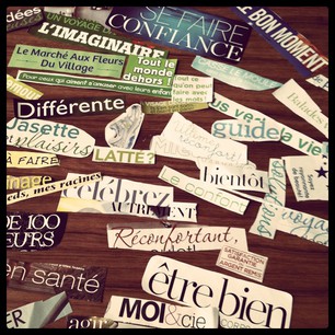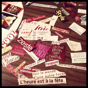 Tiens, on dirait que je suis en train de faire un bilan, non!?! Alors, avant de tomber sur des sujets trop délicats, voici quelques photos de cette belle activité. Cette année, j’avais le goût d’organiser ma roue par couleurs et intérêts. C’est subtile, juste assez pour que je le remarque moi-même. J’ai mis de côté au moins autant de mots et d’images, mais que voulez-vous, je suis une vraie passionnée! Certains ont même été adoptés par d’autres pendant l’activité, vive le partage!