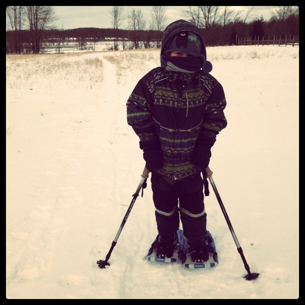 L’année dernière, nous sommes arrivés dans notre maison en plein hiver et avec le vent qui est roi ici, nous n’avons pas vraiment profité des joies de l’hiver. Je rêvais secrètement d’en avoir depuis longtemps et avec Papabooh, nous sommes arrivés à la conclusion que si nous voulions jouer dehors, faire une activité familiale à peu de frais, chez nous, dans la belle nature qui nous entoure, ça nous prenait des… Raquettes!